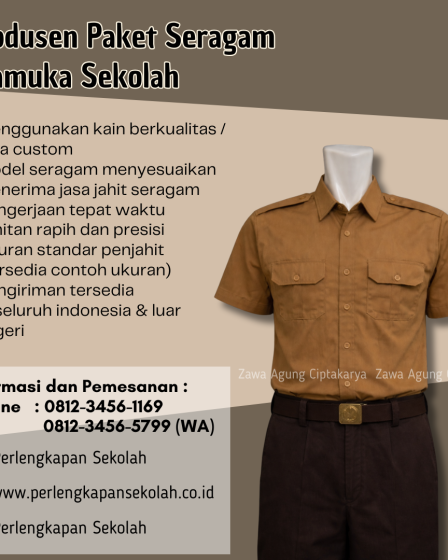 Kami ZAC (Zawa Agung Ciptakarya) adalah produsen dan supplier segala macam kebutuhan perlengkapan siswa dan sekolah yang berlokasi di Sidoarjo, Jawa Timur. Kami membantu anda dalam pembuatan dan penyediaan kebutuhan sekolah terlengkap, berkualitas dan terjangkau, menyangkut : topi, dasi, seragam, sabuk,kaos kaki, badge, Map ijazah, perlengkapan pramuka dan perlengkapan sekolah lainnya. Menyediakan celana dan rok …