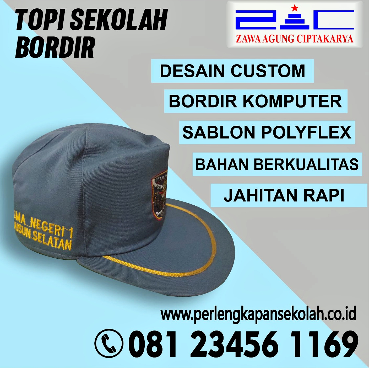 Topi Sekolah Siswa anda sudah usang dan gampang rusak ??Anda perlu mencoba memesan atribut dan perlengakapan sekolah siswa-siswi kepada kami Zawa Agung Ciptakarya karna semua produk kami sudah terjamin kualitasnya, awet dan bergaransi..Seperti produksi terbaru kami TOPI ABU-ABU SMK KERTA CENDEKIA Sidoarjo..Jadi Segera pesan di sini !!Informasi dan Pemesanan :・Hotline : 0812-3456-1169 / 0812-3456-5799 (WA)・Telp …