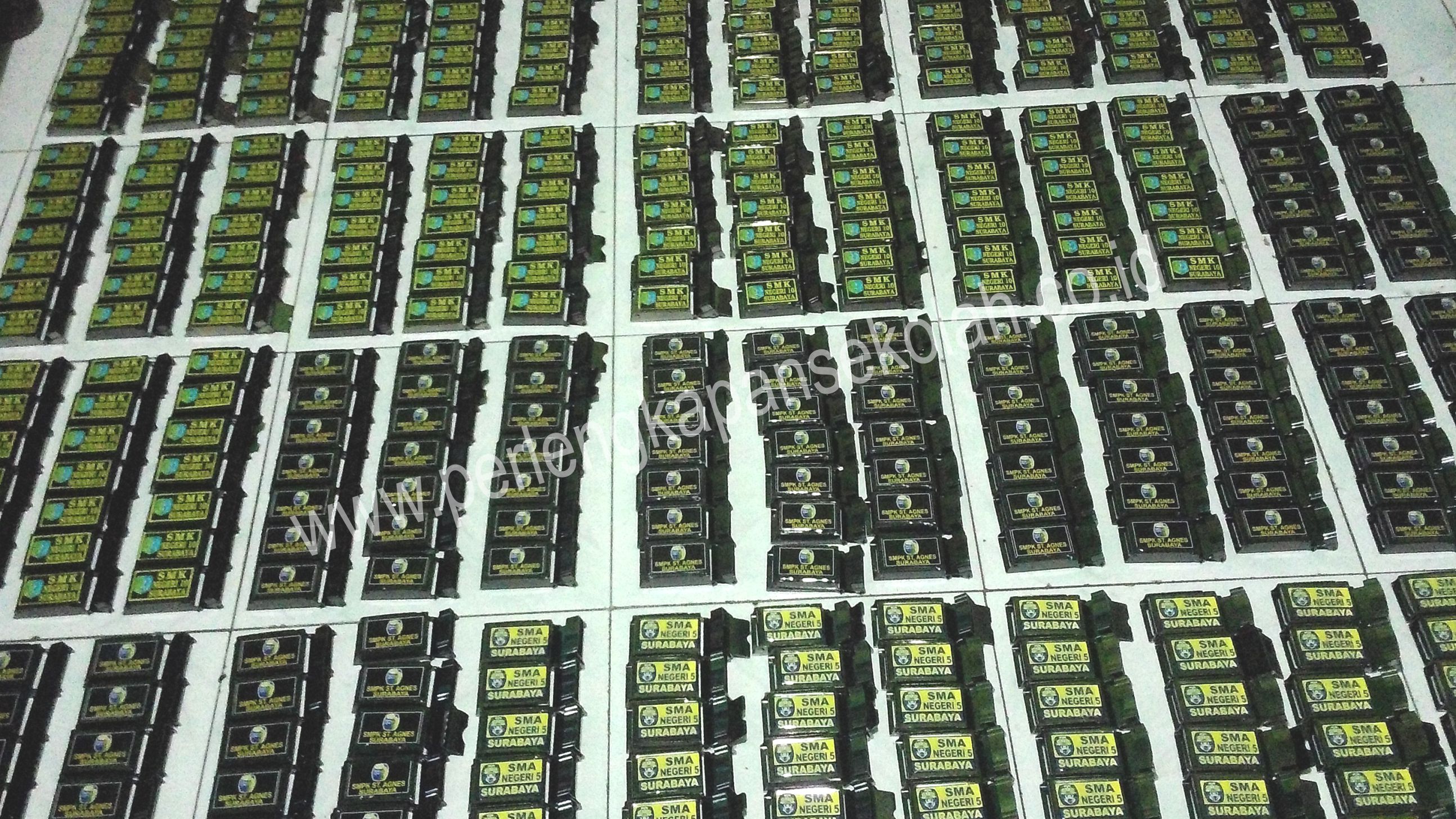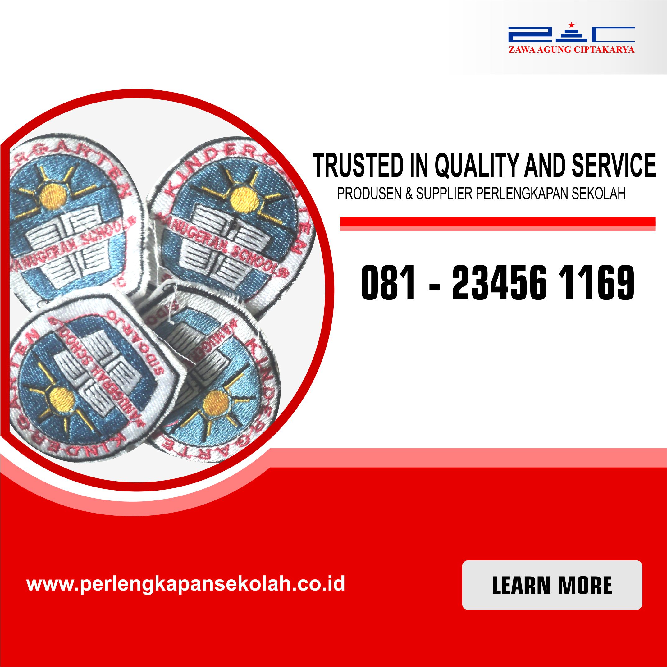 Dengan nama logo dan nama sekolah yang disablon dan didesain sesuai permintaan pemesan.